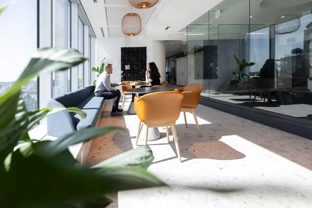Sandstorm a voulu un espace qui fait écho à son activité. Chaque étage expose des échantillons de roches et d’outils miniers, et les salles de réunion sont signalées par des boîtes végétalisées gravées des symboles d’éléments du tableau périodique : Zinc, Argent, Porphyre… Un clin d’œil géologique qui ancre littéralement l’entreprise dans son domaine.