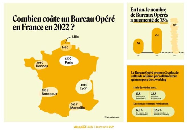En 2022, le prix moyen mensuel d’un poste de travail dans un Bureau Opéré s’élevait à 630 euros à Paris selon le baromètre d’Ubiq. En région, les tarifs sont autour de 400 € / mois et par poste de travail : 340 € à Lille, 450 € à Lyon, 360 € à Marseille, 380 € à Bordeaux et 360 € à Rennes.