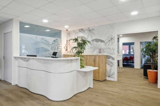 Poussons maintenant les portes pour découvrir les espaces. Dès l’entrée, le hall d’accueil donne le ton. Avec ses lignes épurées, ses couleurs douces et son bardage en bois, il crée une ambiance à la fois conviviale et professionnelle.