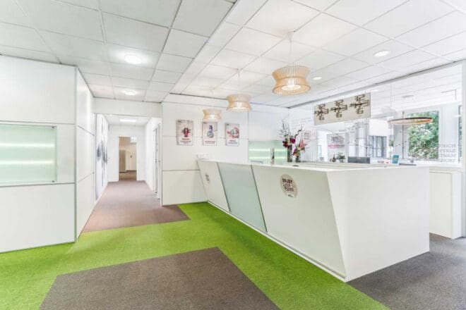 En véritable espace de coworking moderne, le centre dispose de 80 postes de travail qui se répartissent entre bureaux privés et en open space. De quoi offrir un espace adapté aux besoins de chaque professionnel dans un cadre spacieux. À l’intérieur, une atmosphère calme, propice à la concentration, règne, avec des zones dédiées aux petites équipes comme aux grandes réunions.