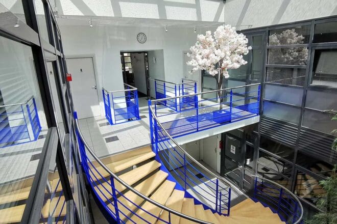 Autour de l’atrium, on retrouve ainsi 16 bureaux modulables, lumineux et climatisés de 1 à 13 postes et 2 espaces ouverts d’une dizaine de poste chacun, tous équipés avec du mobilier design et ergonomique.