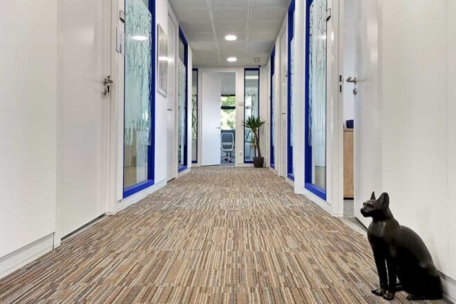 À l’intérieur, les cloisons Clestra Synchrone et les portes toute hauteur offrent une excellente isolation phonique, tout comme les menuiseries intérieures et extérieures à double vitrage. L’éclairage à LED avec variateur d’intensité permet d’avoir toujours une lumière suffisante pour travailler tout en assurant une gestion optimisée de la consommation électrique.