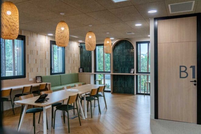 Au cœur du lieu : une cuisine partagée avec terrasse, micro-ondes, machine à café à grains, eau filtrée plate ou gazeuse, et de la vaisselle réutilisable. « Les gens sont souvent surpris de tomber directement sur la cuisine en arrivant, mais c’est volontaire : c’est un espace central, un lieu de rencontre », explique-t-elle. Pas d’ambiance corporate ou aseptisée ici, mais un cadre chaleureux et apaisant, aux tons verts et boisés, imaginé avec l’architecte d’intérieur local Jean-Benoît Larcher.