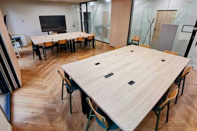Côté réunion, deux formats. Une petite salle de 11 m² permet d’organiser des entretiens, des rendez-vous clients ou des sessions de travail à deux ou trois. Et pour les formats plus ambitieux, une grande salle de 44 m², divisible en deux espaces de 22 m², accueille jusqu’à 30 personnes. « On peut moduler facilement selon le type d’événement : atelier, formation, conférence… », précise Margot. Écrans, tableau blanc, écran tactile, tout est en place.