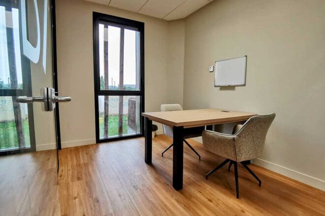 Viennent ensuite les bureaux privatifs, à partir de 12,50 € HT de l’heure ou 55 € HT la journée. Un forfait 10 heures est proposé à 75 €, et il est aussi possible de réserver à la semaine, ou à la fréquence choisie : 1 jour par semaine pour 200 € HT/mois, 3 jours pour 500 € HT/mois. L’un des bureaux est adapté PMR avec un poste assis-debout, les autres conviennent pour un usage ponctuel ou semi-régulier.