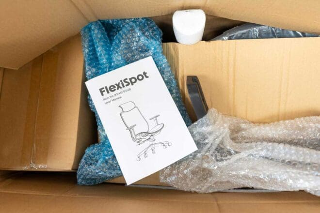 Commander la Flexispot BS4 a été un jeu d’enfant. Passée pendant le Black Friday, la chaise était en stock, et son prix réduit à 127,50 € HT au lieu de 249,99 € TTC rendait l’affaire encore plus alléchante. Aucun frais de livraison à prévoir en Belgique, en France et au Luxembourg, et un suivi irréprochable : confirmation immédiate par email, suivi du colis via DPD, et facture envoyée le jour de la livraison. Après une attente de moins de deux semaines, la chaise est arrivée le 11 décembre dans un emballage impeccable.