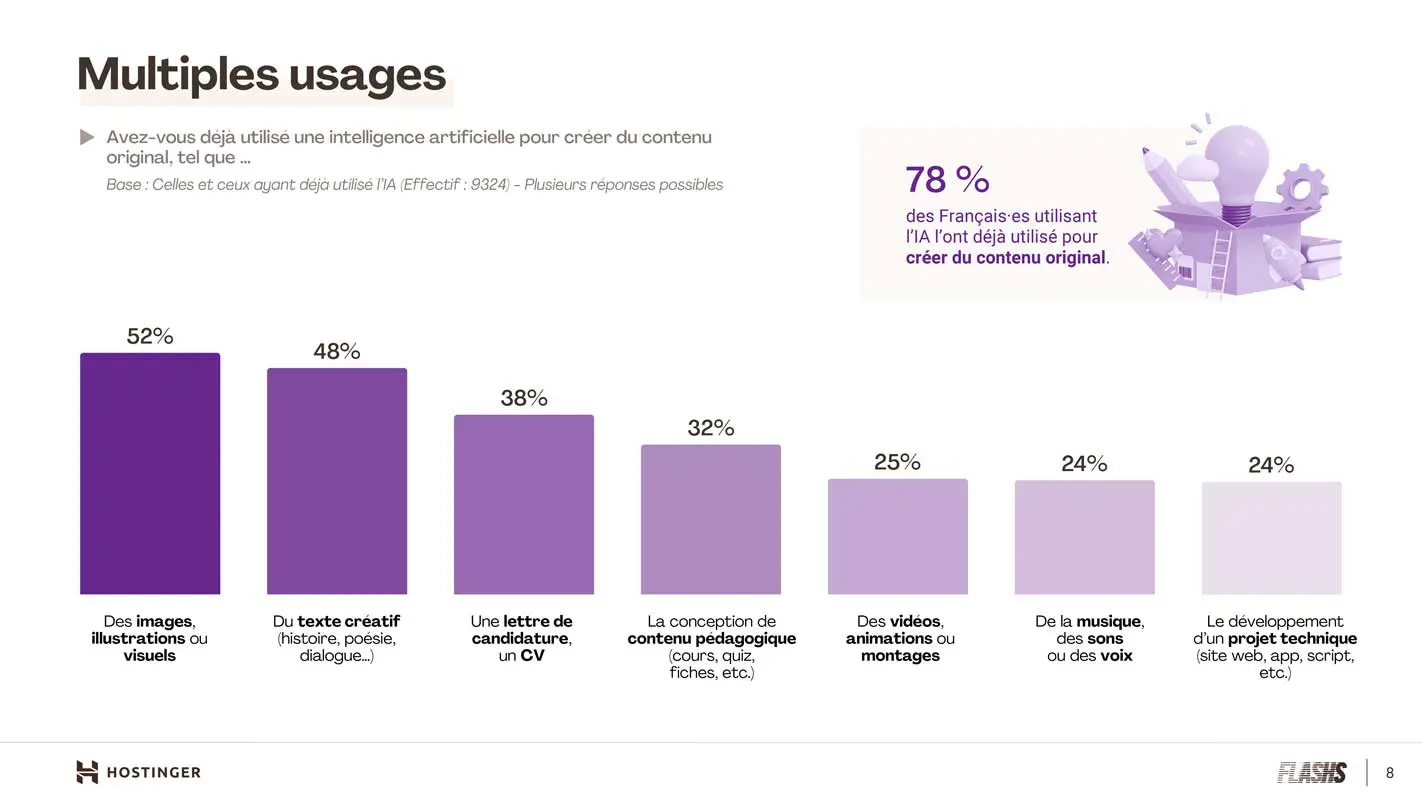 Loin d’un simple gadget ou d’une curiosité technologique, l’IA entre désormais dans des tâches concrètes. 78 % des utilisateurs l’ont déjà sollicitée pour créer du contenu original, bien au-delà des simples images ou textes fantaisistes.