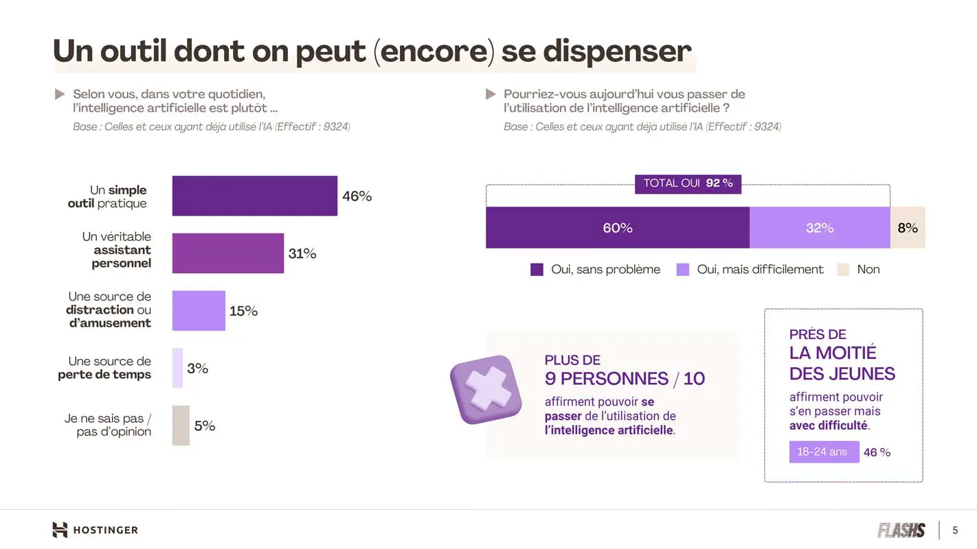 Mais cette généralisation ne rime pas (encore) avec dépendance. Si l’IA séduit, elle ne s’impose pas : 92 % des utilisateurs affirment pouvoir s’en passer. La moitié sans difficulté, l’autre moitié en reconnaissant que ce serait moins confortable. L’équilibre est précaire.