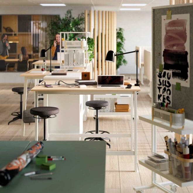 Pensée pour les environnements partagés, la gamme Mittzon propose des bureaux modulables, des cloisons acoustiques et des rangements sobres. L’objectif : créer un espace de travail calme, adaptable et visuellement cohérent. Le tout à des prix accessibles, fidèles à l’ADN Ikea.