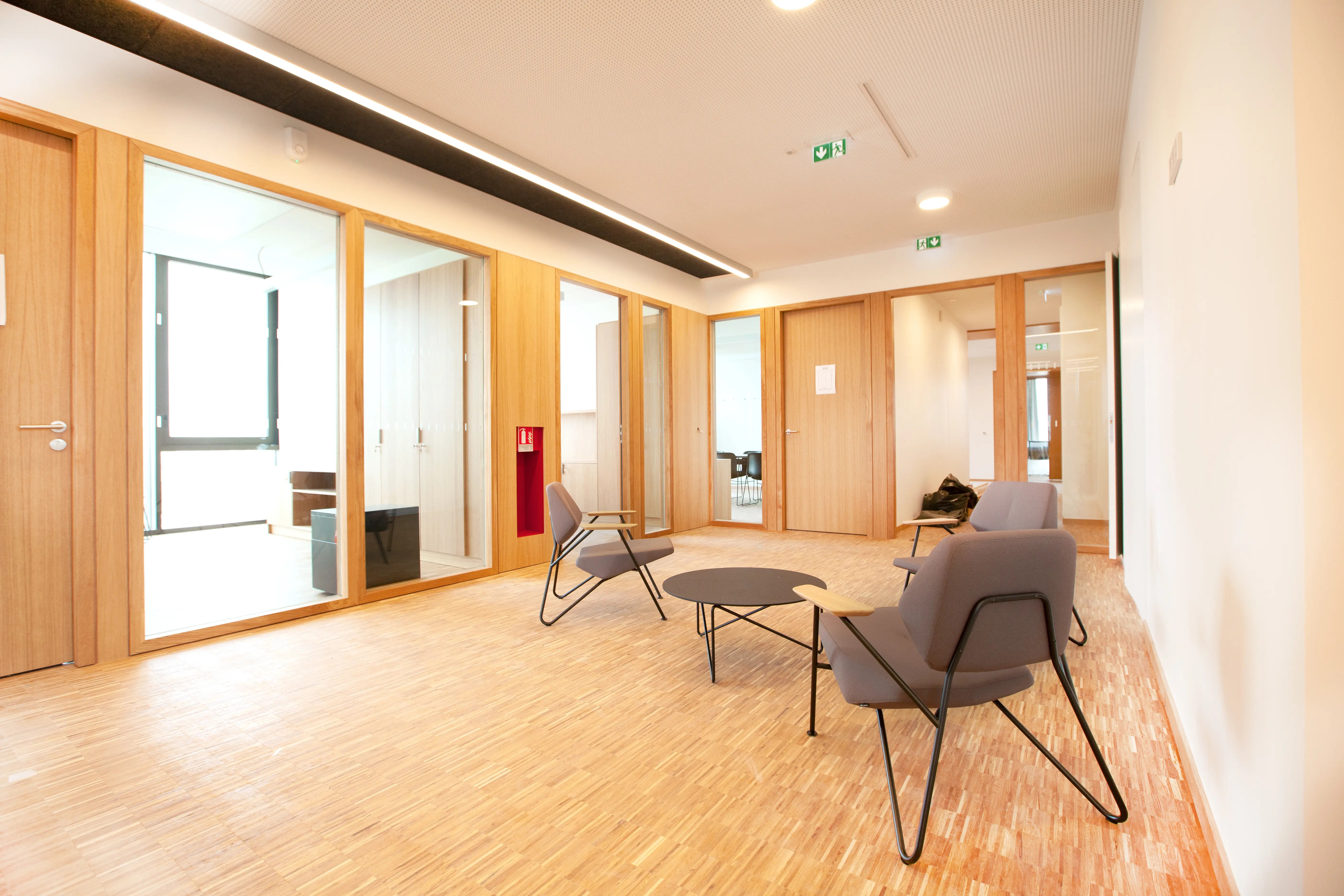 La grande salle de réception, d’autres bureaux et espaces de convivialité se trouvent au quatrième étage, où l’atrium cède la place à d’autres aménagements pour des raisons structurelles. Environ 75 postes de travail se répartissent dans l’ensemble du bâtiment, sur une superficie globale de 2 800 m², offrant une vue sur l’activité foisonnante du port.