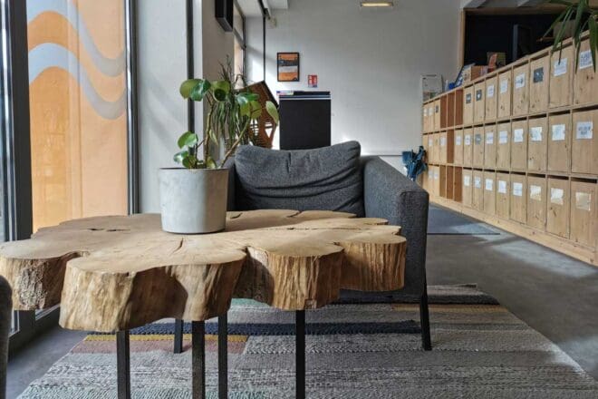 Le Grub met à disposition des professionnels abonnés mensuellement des espaces bureaux accessibles 24/7, ainsi qu’une option de coworking flexible et la possibilité de domiciliation d’entreprise. L’aménagement a été entièrement imaginé à partir d’objets de récupération et d’artisanat, avec du mobilier et des décorations en bois faites main par Nils et son associé Luc, afin d’accentuer l’atmosphère unique du lieu. « Tout ce que vous voyez en bois a été fabriqué par nos soins, » souligne Nils, « et pour le métal, nous avons fait appel à une ferronnerie sur mesure. »