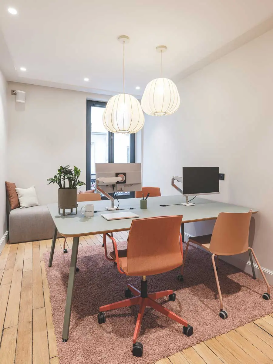 En tant que lieu de vie, le rez-de-chaussée accueille les visiteurs avec des espaces de convivialité comprenant le café Joyeux, des fruits frais, et une matériauthèque. Un écran diffuse les précédentes réalisations de MAKE Office, facilitant la projection des clients dans leurs futurs espaces rénovés. Des luminaires, sols, peintures, assises et plantes variées ajoutent à l’atmosphère accueillante et flexible des bureaux, qui favorisent également la flexibilité pour les cinq collaborateurs travaillant en flex office.