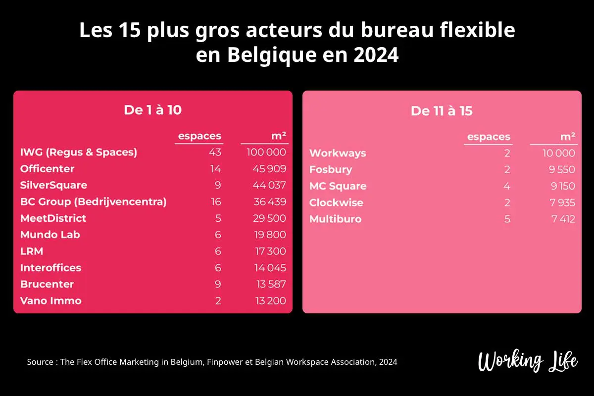 Le secteur reste très fragmenté. Plus de la moitié des centres sont des structures indépendantes. IWG domine largement avec près de 100 000 m², suivi par Officenter et Silversquare. La superficie moyenne tourne autour de 1 600 m², avec de fortes disparités entre Bruxelles et les espaces plus confidentiels en Wallonie ou en Flandre.