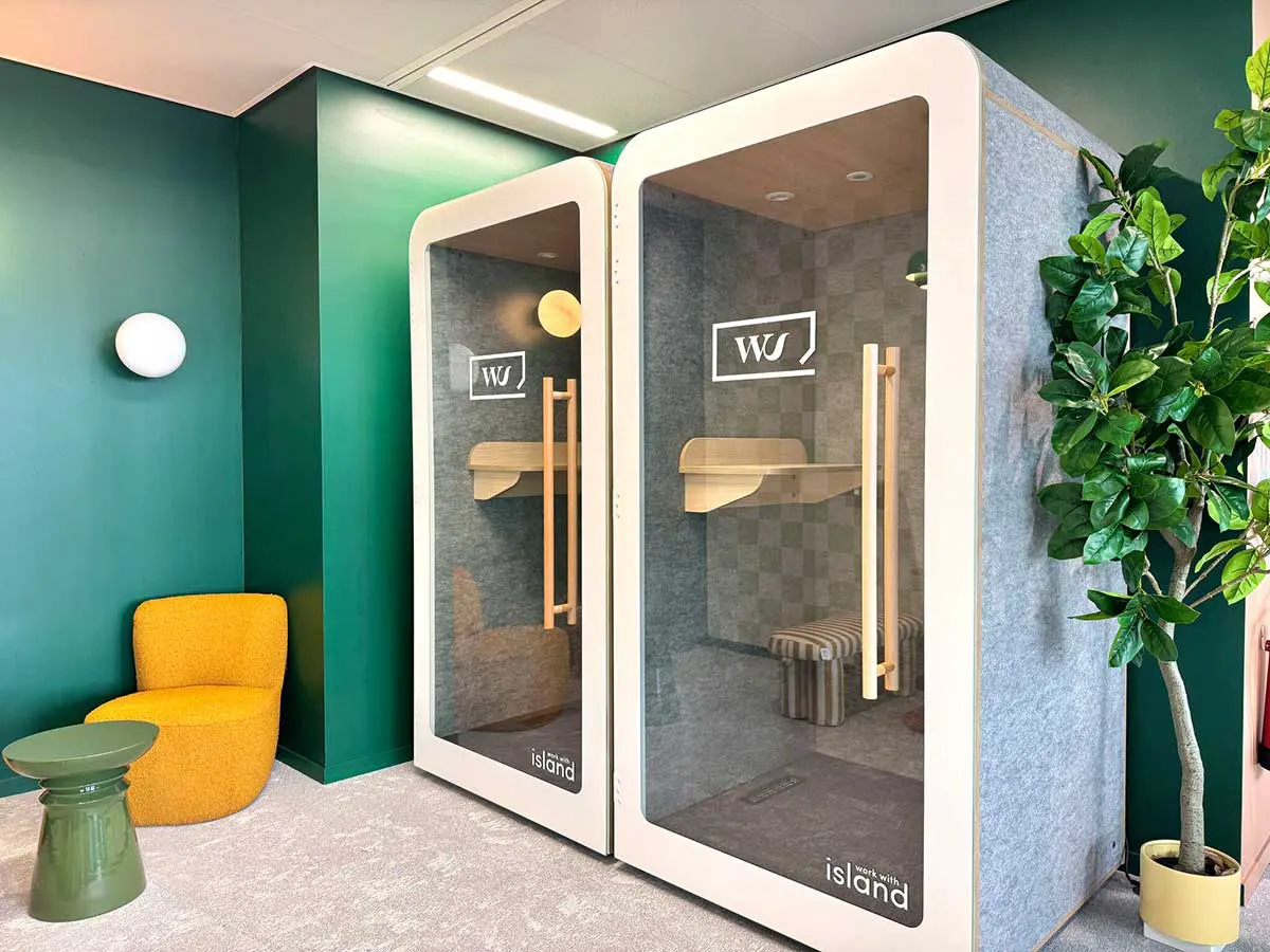 Work & Share y déploie un espace de 1 300 m², conçu pour accueillir jusqu’à 150 postes. Bureaux, salles de réunion modulables, phonebox, alcôves de travail, zones de détente, bistrot central, terrasse panoramique… Le lieu joue la carte du tout-en-un, avec une ambiance soignée et une grande variété d’usages.